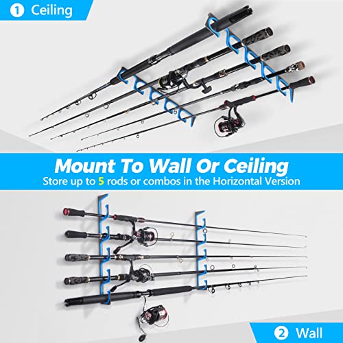 PLUSINNO H5 Horizontal Fishing Rod/Pole Holders, Fishing Pole Holders for Garage, Wall or Ceiling Mounted Fishing Rod Rack, Aviation Aluminum Rod Holder Holds 5 Rod or Combos or Nets Storage Racks